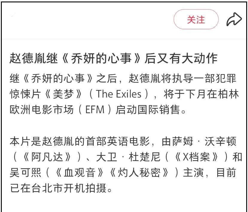 当时众人认为他可能会与赵丽颖合作,但最新消息显示,这部《美梦》的女主角似乎是吴可熙,据传这位女演员被猜测是赵德胤的前女友。